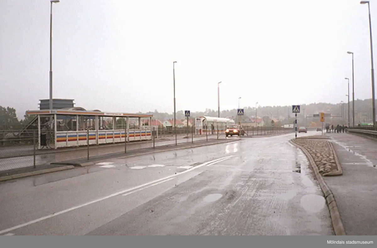 Busshhållplatser och trafik på bron. Mölndalsbro i dag - ett skolpedagogiskt dokumentationsprojekt på Mölndals museum under oktober 1996. 1996_1212-1226 är gjorda av högstadieelever från Kvarnbyskolan 9D, grupp 5. Se även 1996_0913-0940.