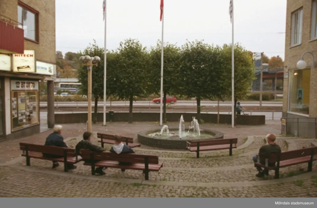 Personer sitter på bänkar i början av Brogatan. Göteborgsvägen passerar i bakgrunden. Mölndalsbro i dag - ett skolpedagogiskt dokumentationsprojekt på Mölndals museum under oktober 1996. 1996_1246-1263 är gjorda av högstadieelever från Åbyskolan 8A, grupp 1. Se även 1996_0913-0940.
