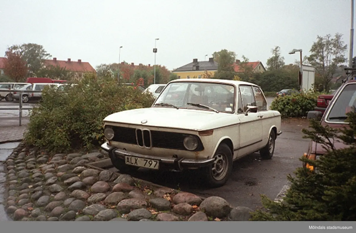 Bilar uppställda på en parkeringsplats. Mölndalsbro i dag - ett skolpedagogiskt dokumentationsprojekt på Mölndals museum under oktober 1996. 1996_1227-1245 är gjorda av högstadieelever från Kvarnbyskolan 9D, grupp 6. Se även 1996_0913-0940.
