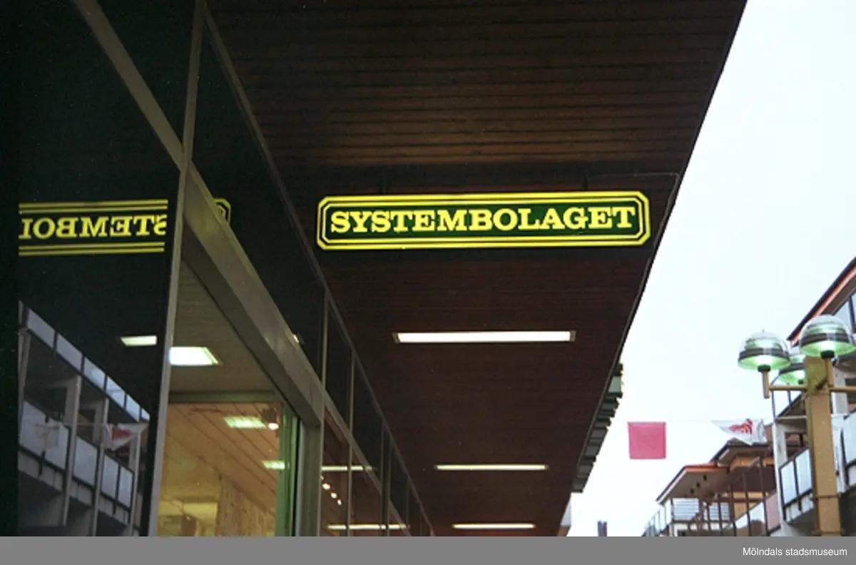 Exteriör av Systembolagets skylt på Brogatan. Mölndalsbro i dag - ett skolpedagogiskt dokumentationsprojekt på Mölndals museum under oktober 1996. 1996_1283-1300 är gjorda av högstadieelever från Åbyskolan 8A, grupp 3. Se även 1996_0913-0940, gruppbilder på klasserna 1996_1382-1405 och bilder från den färdiga utställningen 1996_1358-1381.