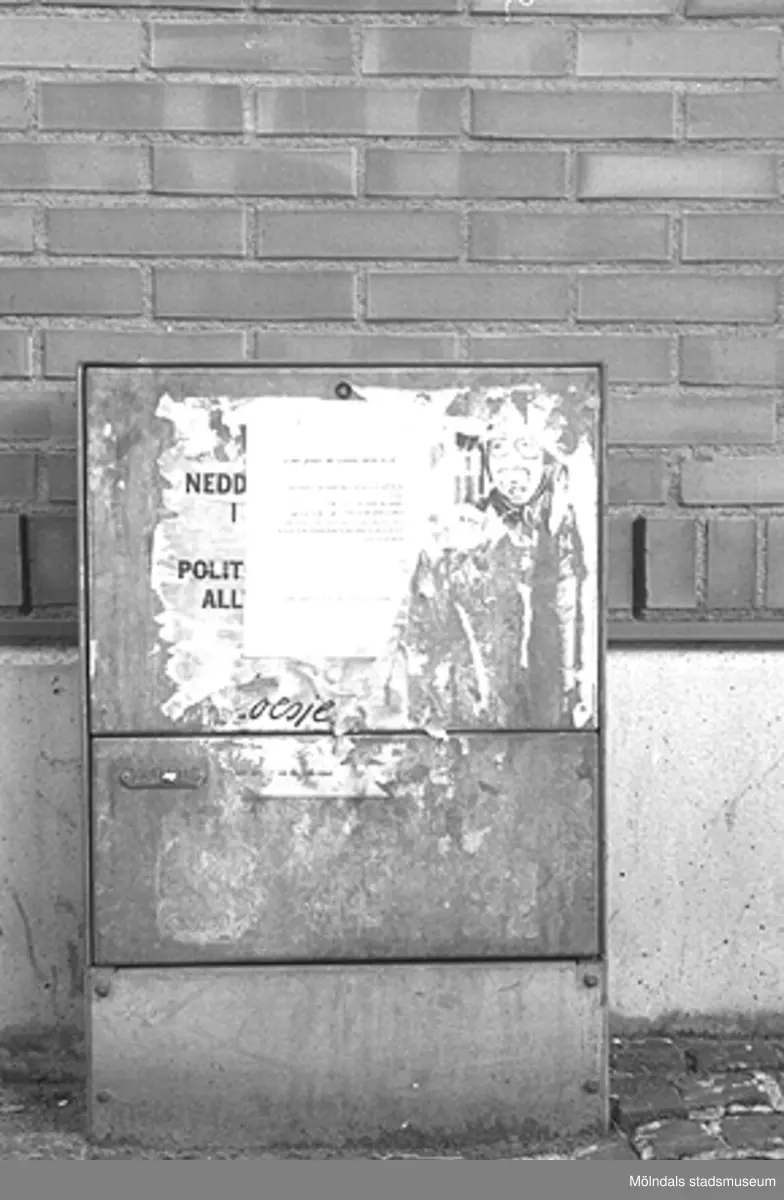 Ett elskåp utmed en tegelfasad. Mölndalsbro i dag - ett skolpedagogiskt dokumentationsprojekt på Mölndals museum under oktober 1996. 1996_0968-0986 är gjorda av högstadieelever från Kvarnbyskolan 9A, grupp 4. Se även 1996_0913-0940, gruppbilder på klasserna 1996_1382-1405 samt bilder från den färdiga utställningen 1996_1358-1381.