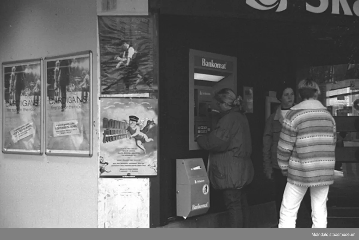 Bankomat utanför Skanvinaviska Enskilda Banken på Brogatan. Mölndalsbro i dag - ett skolpedagogiskt dokumentationsprojekt på Mölndals museum under oktober 1996. 1996_0991-1004 är gjorda av högstadieelever från Kvarnbyskolan 9A, grupp 5. Se även 1996_0913-0940, gruppbilder på klasserna 1996_1382-1405 samt bilder från den färdiga utställningen 1996_1358-1381.