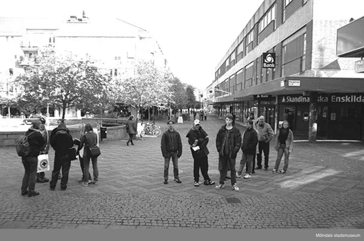 Ungdomar vid Alberts torg. Mölndalsbro i dag - ett skolpedagogiskt dokumentationsprojekt på Mölndals museum under oktober 1996. 1996_1005-1023 är gjorda av högstadieelever från Kvarnbyskolan 9A, grupp 6. Se även 1996_0913-0940, gruppbilder på klasserna 1996_1382-1405 samt bilder från den färdiga utställningen 1996_1358-1381.