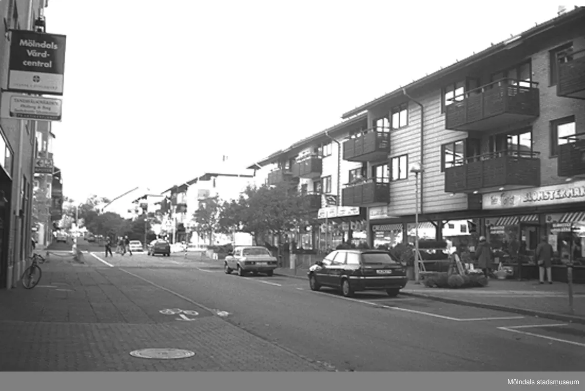 Bergmansgatan västerut. Mölndalsbro i dag - ett skolpedagogiskt dokumentationsprojekt på Mölndals museum under oktober 1996. 1996_1061-1076 är gjorda av högstadieelever från Kvarnbyskolan 9C, grupp 3. Se även 1996_0913-0940, gruppbilder på klasserna 1996_1382-1405 samt bilder från den färdiga utställningen 1996_1358-1381.