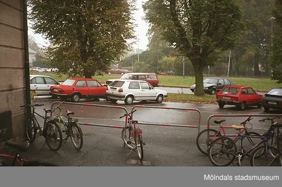 Parkerade cyklar och bilar utanför en stenbyggnad. Mölndalsbro i dag - ett skolpedagogiskt dokumentationsprojekt på Mölndals museum under oktober 1996. 1996_1190-1211 är gjorda av högstadieelever från Kvarnbyskolan 9D, grupp 4. Se även 1996_0913-0940.