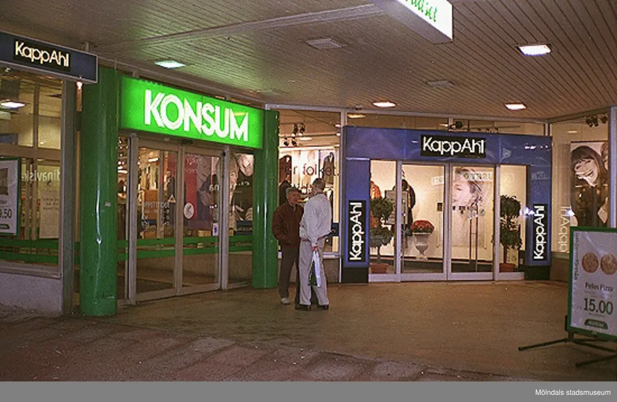 Konsum och KappAhl på Brogatan. Mölndalsbro i dag - ett skolpedagogiskt dokumentationsprojekt på Mölndals museum under oktober 1996. 1996_1212-1226 är gjorda av högstadieelever från Kvarnbyskolan 9D, grupp 5. Se även 1996_0913-0940.