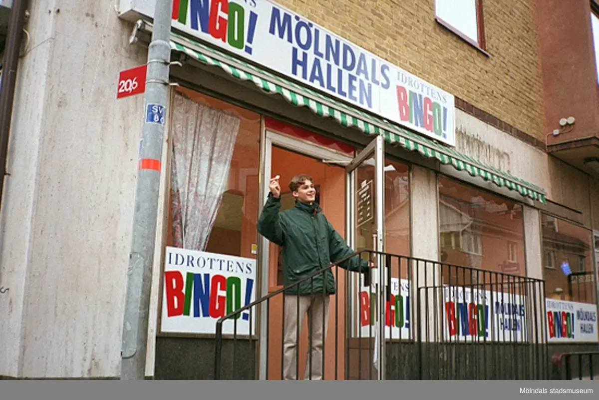 En ung man står utanför Idrottens Bingo!/Mölndalshallen på Bergmansgatan. Mölndalsbro i dag - ett skolpedagogiskt dokumentationsprojekt på Mölndals museum under oktober 1996. 1996_1227-1245 är gjorda av högstadieelever från Kvarnbyskolan 9D, grupp 6. Se även 1996_0913-0940.