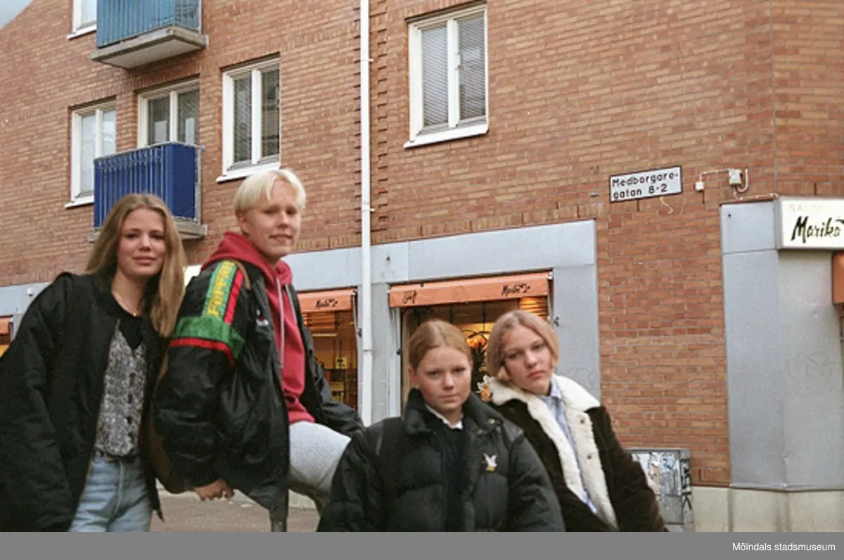 Fyra skolungdomar på Medborgaregatan. Mölndalsbro i dag - ett skolpedagogiskt dokumentationsprojekt på Mölndals museum under oktober 1996. 1996_1283-1300 är gjorda av högstadieelever från Åbyskolan 8A, grupp 3. Se även 1996_0913-0940, gruppbilder på klasserna 1996_1382-1405 och bilder från den färdiga utställningen 1996_1358-1381.