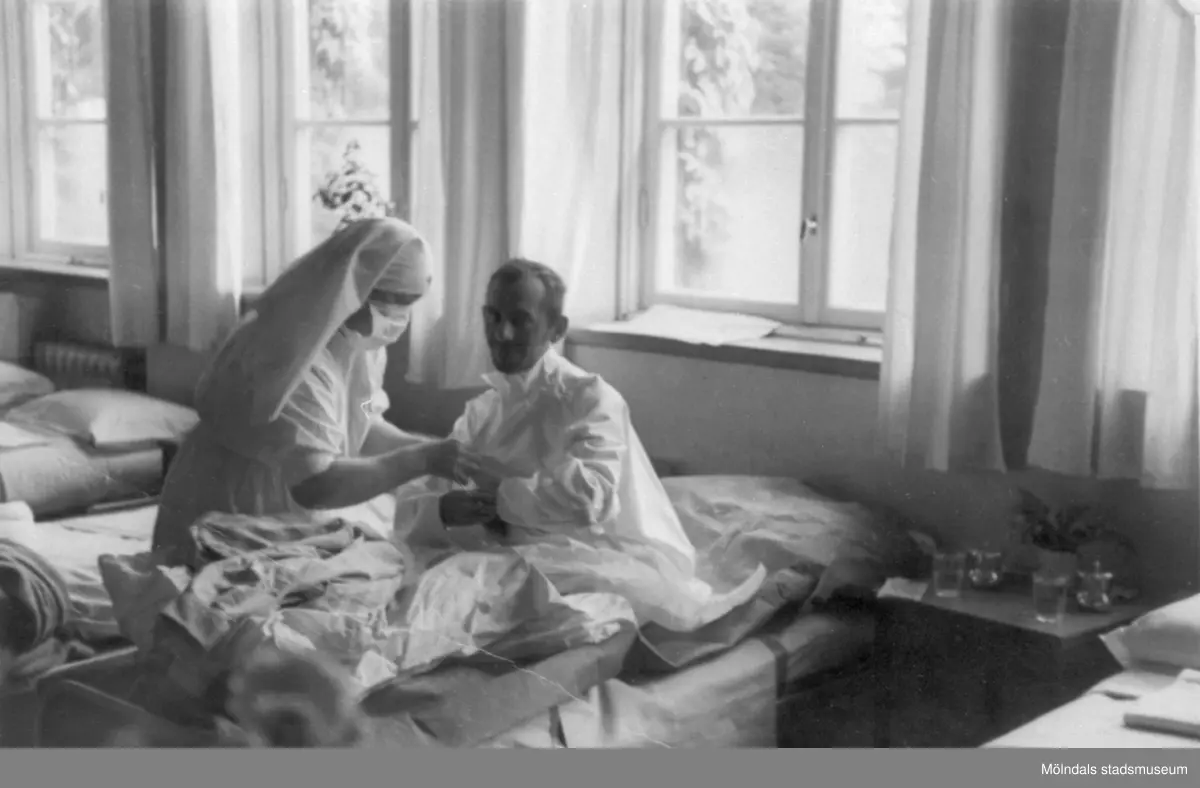 Manlig flykting i sjuksäng och en sköterska.