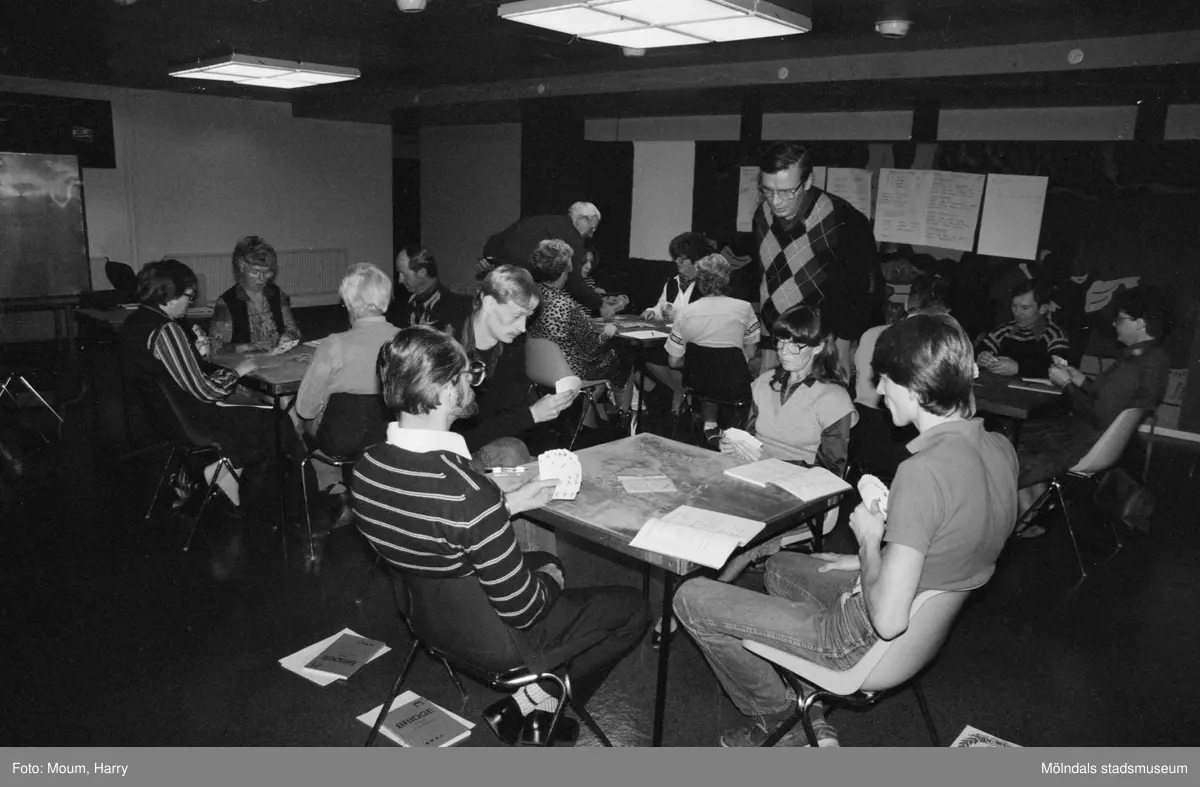 Bridgesällskapet SANG i Kållered har nybörjarkurs i bridge på fritidsgården i Kållered, år 1983. "På bilden ses Jan Erixon undervisa Christer Nielsen, Ove Nielsen, Kjell Åke Skog och Berit Anselm."