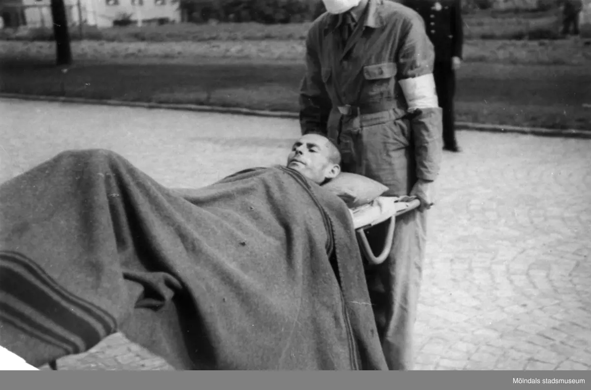 Manlig flykting på bår, buren av Röda Korsets personal.