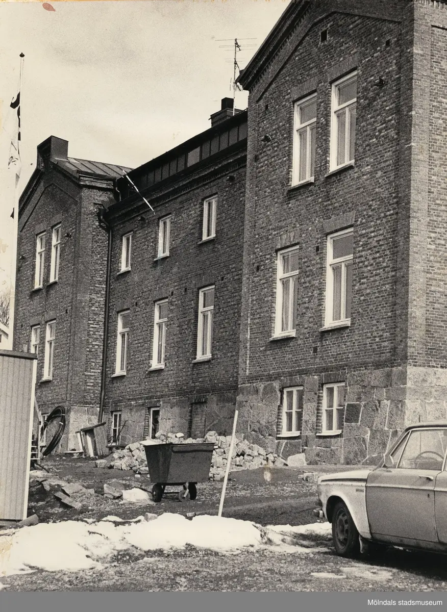 Exteriörbild. Mölndals museum (senare Mölndals stadsmuseum) öppnades för allmänheten 1987. Bilden är tagen i början av mars 1986. Sedan 22 april 1997 ändrades gatunamnet Norra Forsåkersgatan. I byggnaden har tidigare funnits Mölndals sjukstuga samt polisstation.