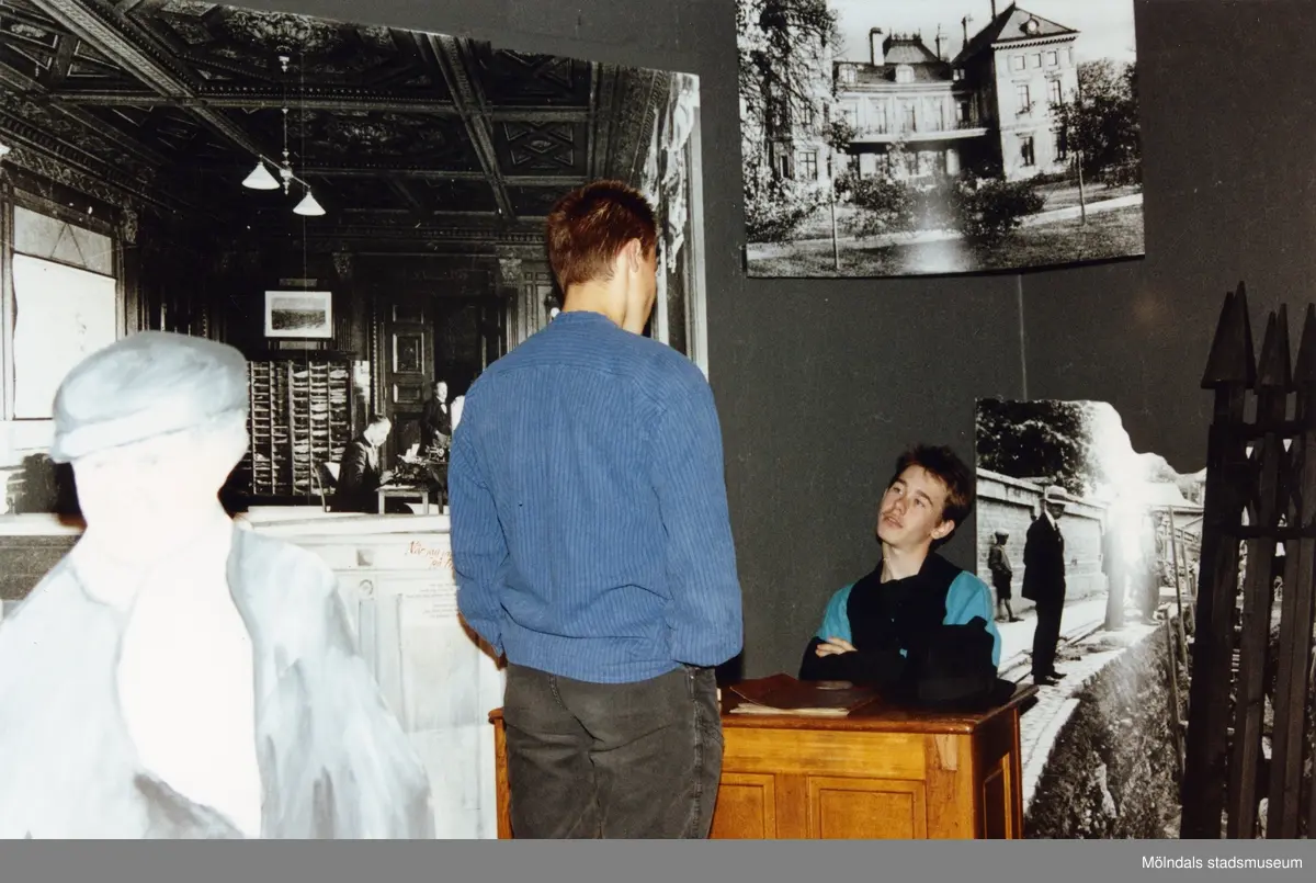 Foton från projektet "Museet - ett scenrum", 1990-tal. Klass 8A från Kvarnbyskolan dramatiserar i utställningen "Andra skiftet går på" med Papyrus historia som var en del av Mölndals museums basutställning t.o.m. år 2001.