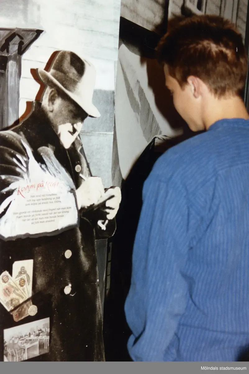 Foton från projektet "Museet - ett scenrum", 1990-tal. Klass 8A från Kvarnbyskolan dramatiserar i utställningen "Andra skiftet går på" med Papyrus historia som var en del av Mölndals museums basutställning t.o.m. år 2001.