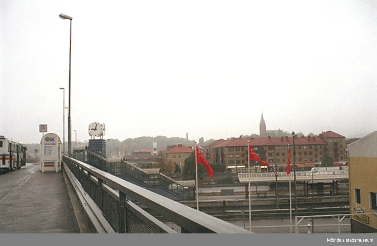 Vy västerut på brons busshållplats. Mölndalsbro i dag - ett skolpedagogiskt dokumentationsprojekt på Mölndals museum under oktober 1996. 1996_1173-1187 är gjorda av högstadieelever från Kvarnbyskolan 9D, grupp 3. Se även 1996_0913-0940.