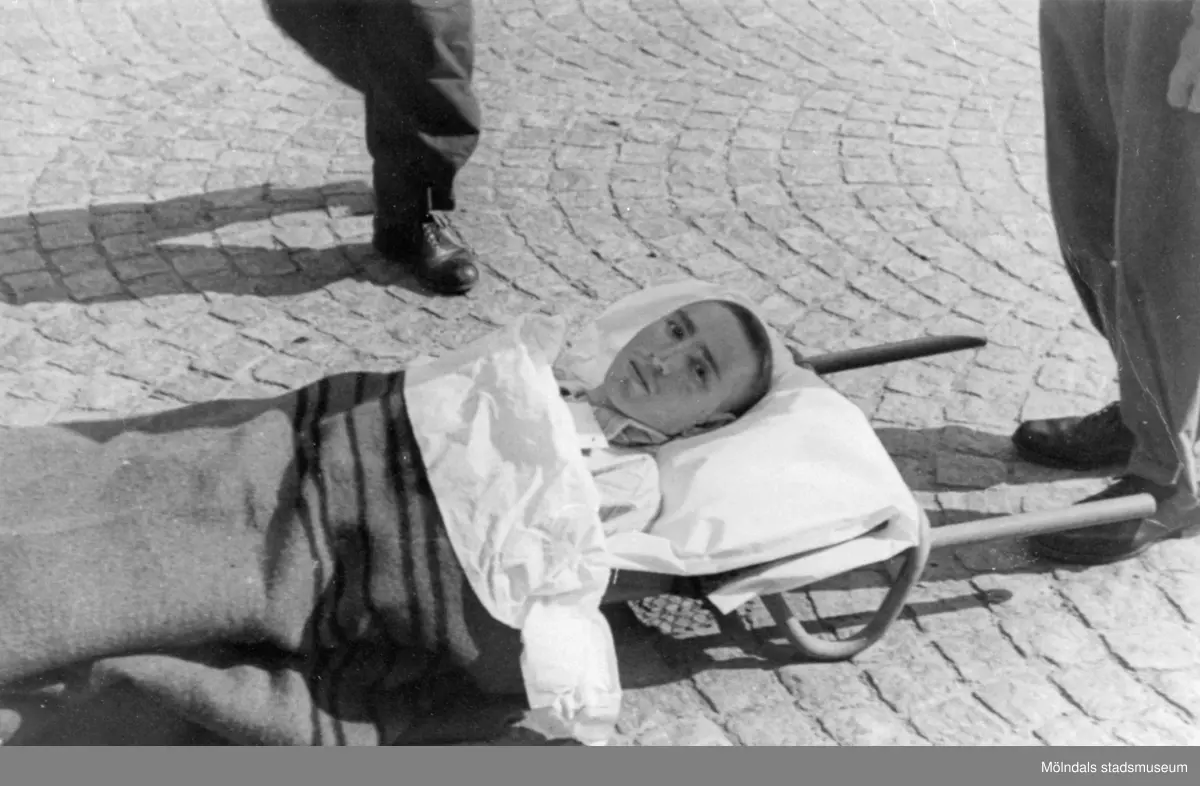 Man ser en sjukling från ett koncentrationsläger 1945. Vederbörande ligger på en bår, som skall föras in i karantänsförläggningen i Kvarnbyskolan. Båren har ställts ned på Alléns stenläggning.
