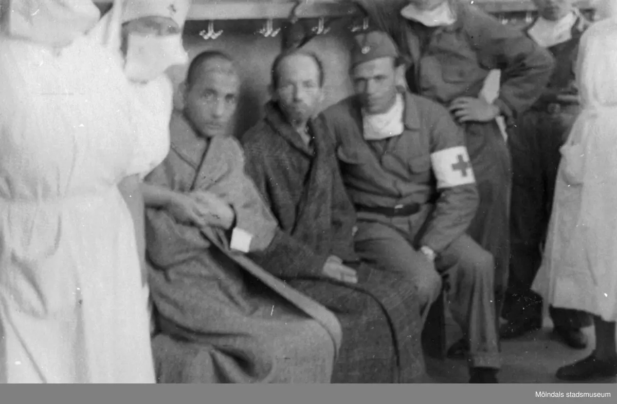Sjuksköterskor, flyktingar från koncentrationsläger tillsammans med Röda korsets personal. Karantänsförläggning i Kvarnbyskolan 1945.