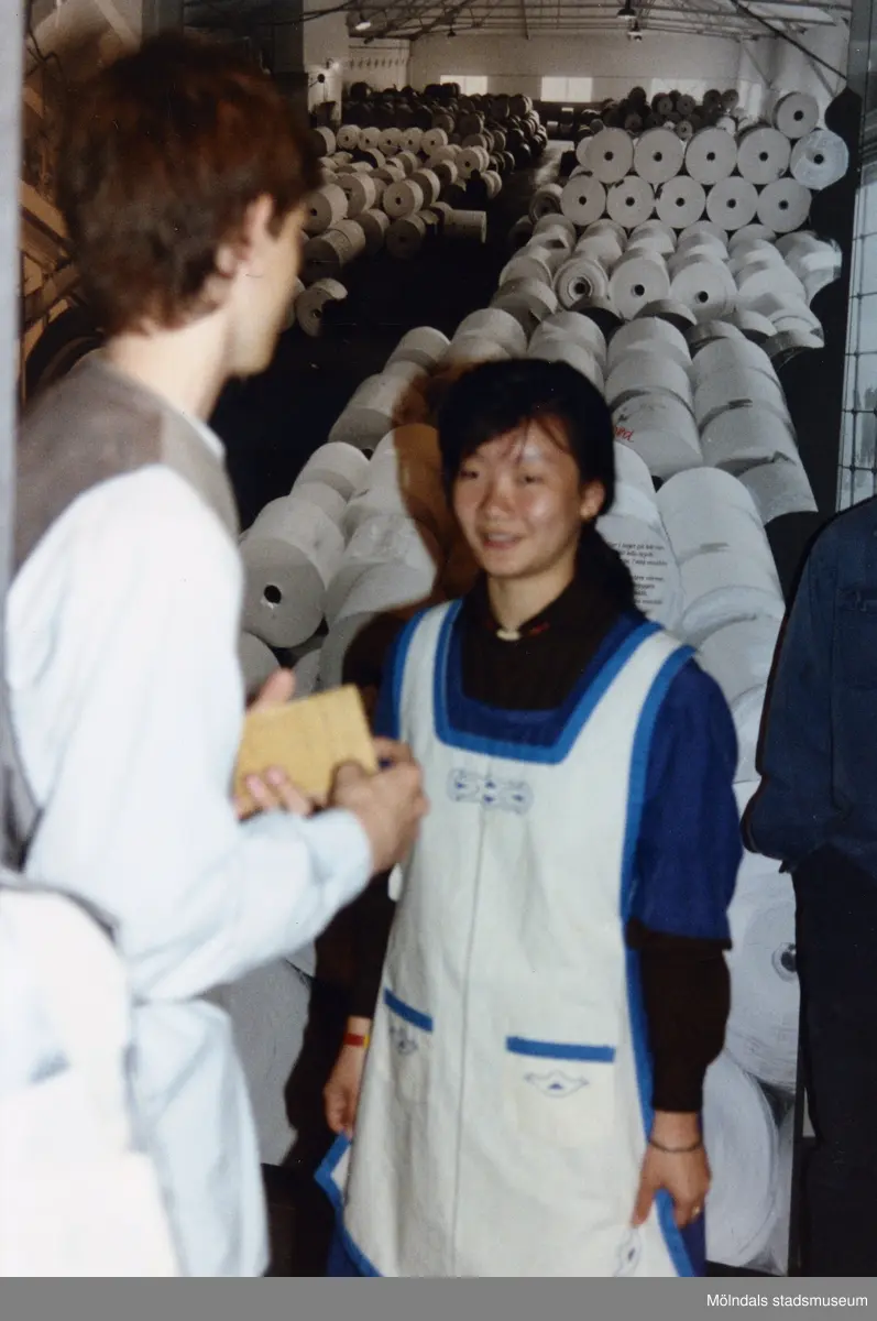 Foton från projektet "Museet - ett scenrum", 1990-tal. Klass 8A från Kvarnbyskolan dramatiserar i utställningen "Andra skiftet går på" med Papyrus historia som var en del av Mölndals museums basutställning t.o.m. år 2001.