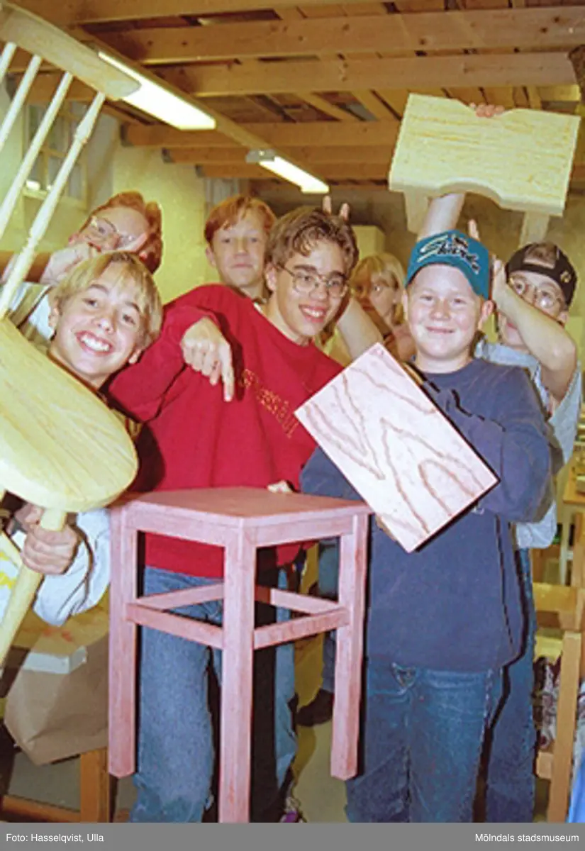 Pedagogisk verksamhet i samband med tillfällig utställning "Lindomemöbler". Bildhuggeri och ådermålning (Almåsskolan klass 8). Se även 1994_0998-1994_1034 samt 1994_1046-1994_1061.