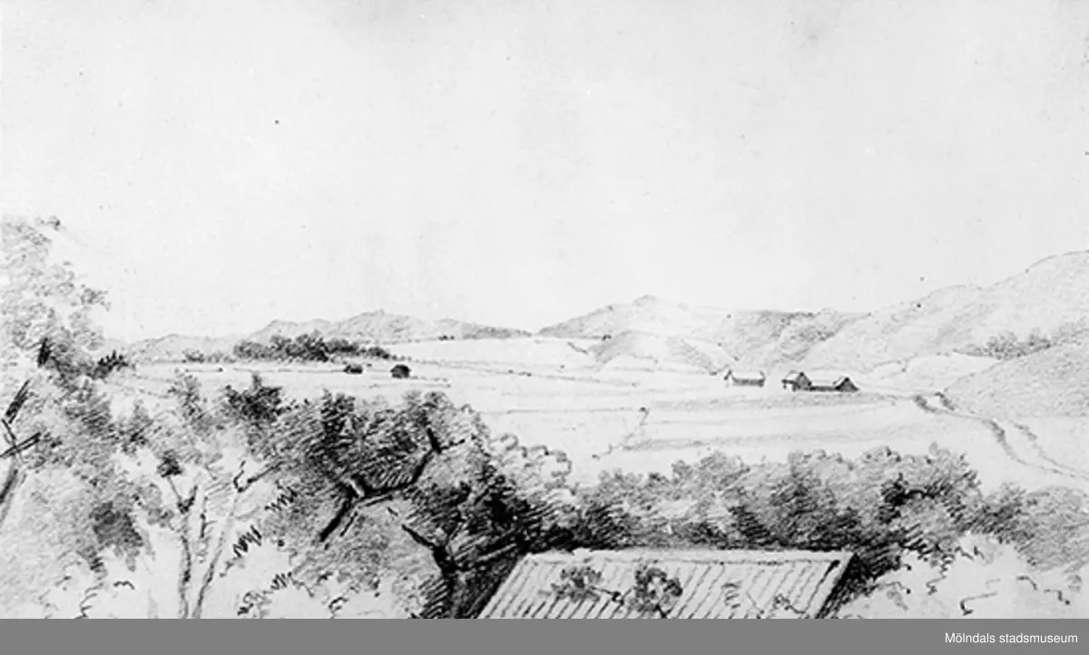 "Lagklarebäck 17 Aug. 1872". Vy sedd från verandan på Lackarebäcks gård i Lackarebäck. Utsikt över dalgången mot Göteborgsvägen och Mölndalsån.