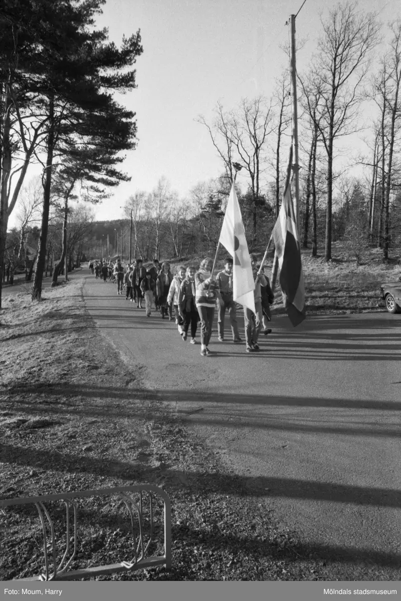 Annestorpsdalens scoutkår tågar från Lindome centrum till Lindome kyrka den 23 april 1984. "Scouterna på väg till Lindome kyrka."