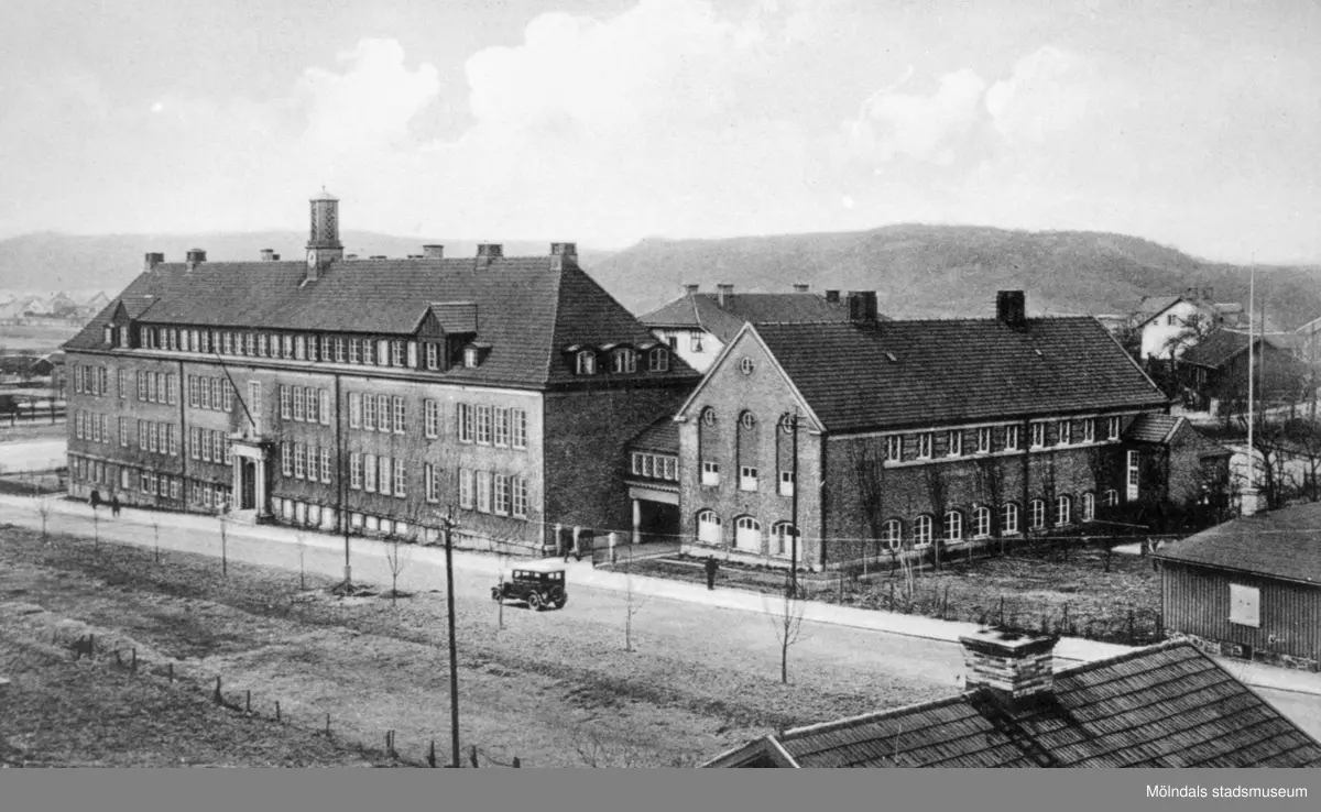 Vykort "Mölndal. Folkskolan" som visar Centralskolan (nuvarande Kvarnbyskolan ) och den nyplanterade Allén Fotograferat från sydost, 1930-tal.