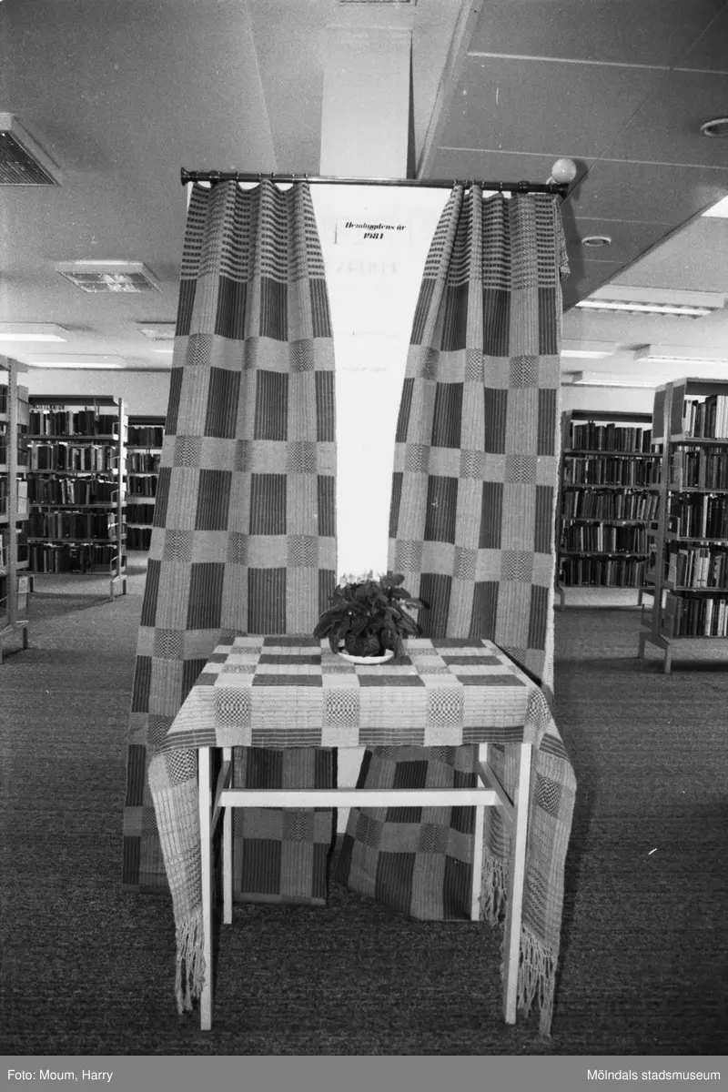 Kållereds hembygdsgille har gardinutställning på Kållereds bibliotek, år 1984. "En av de utställda gardinerna i Kållereds bibliotek."