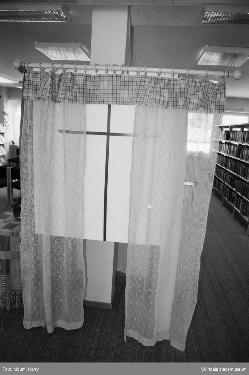 Titel: Kållereds hembygdsgille har gardinutställning på Kållereds bibliotek, år 1984. För mer information om bilden se under tilläggsinformation.