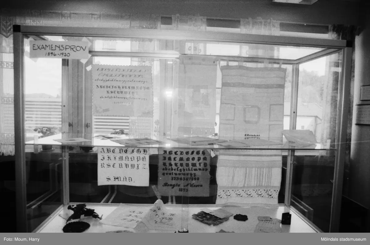 Examensprover från Fruntimmersfors skola 1896-1920 i Kållereds biblioteks permanenta monter, år 1984.