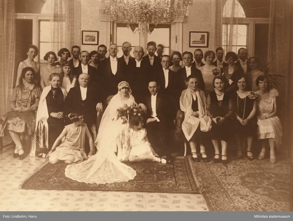 Andra raden från vänster: ?, AnnBritt Nilsson (givarens syster), Elin Andersson, ?, ?, Bror Bolin, Lilly Alminger, Linus Alminger, Edvard Johansson (givarens far), Erik Alminger, Ludvig Hallgren (vigselförättare), Karl-Erik Marmgren, Rudolf Bolin, ?, Jonas Bolin, ?, ?, ?, ?, Gustav Johansson, Beda Bolin.