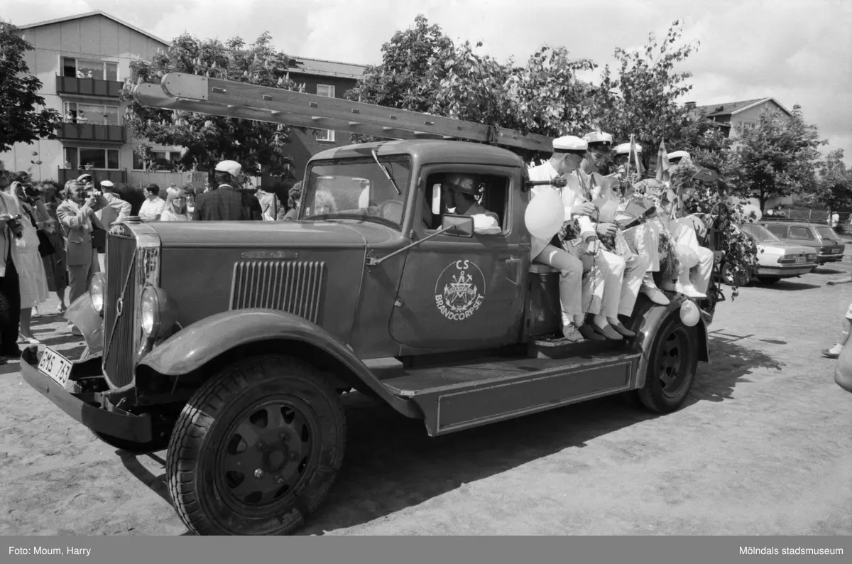 Studentexamen på Fässbergsgymnasiet i Mölndal, år 1985. "En brandbil med påslagna sirener körde detta studentgäng till Kållered."