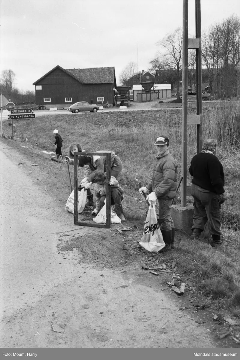 Annestorpsdalens scoutkår städar i Lindome centrum med angränsande områden, år 1985.