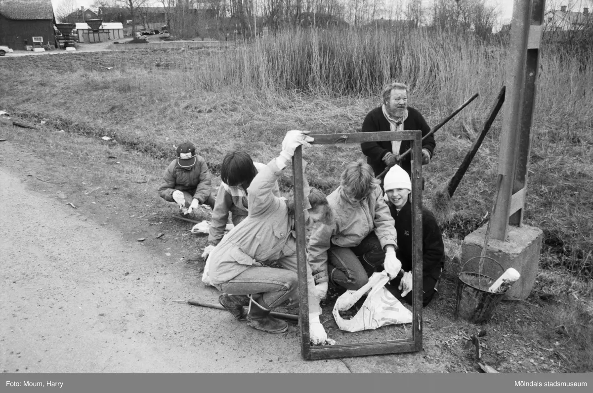 Annestorpsdalens scoutkår städar i Lindome centrum med angränsande områden, år 1985.