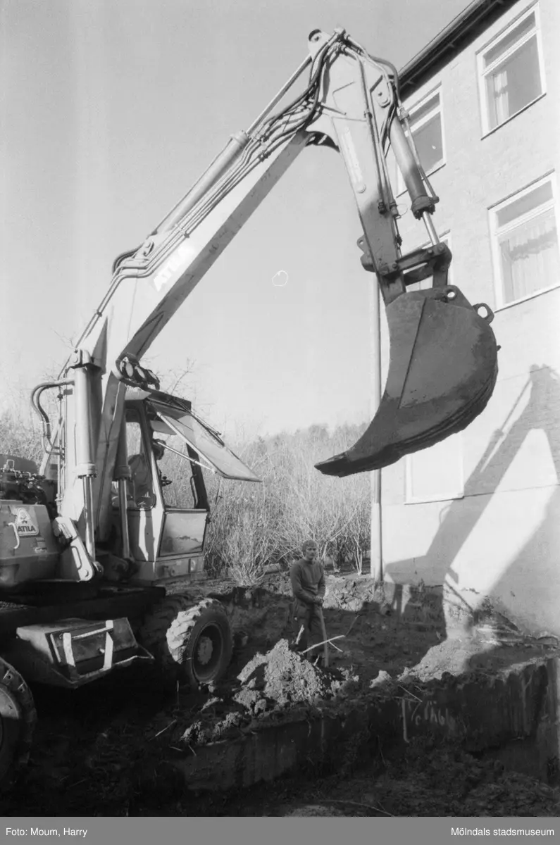 Schaktning för nytt kylrum vid bamba på Brattåsskolan i Kållered, år 1983.