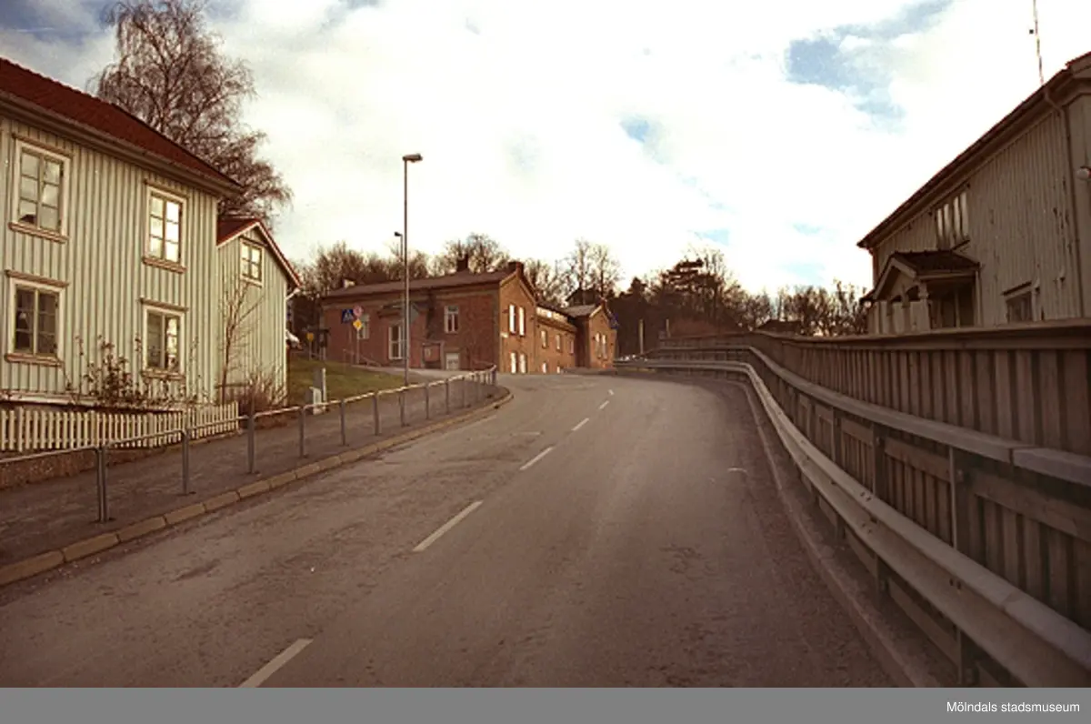 Längst upp i backen skymtar gamla sjukstugan, f.d polishuset och där Mölndals museum tidigare låg (1986-2002), Norra Forsåkersgatan 19 år 2001. Till vänster ses "Kiste-Pers". Här bodde en man som kallades Kiste-Per. Han byggde likkistor åt Korndals fabriker. När en arbetare avled fick familjen en kista av fabriken. På höger sida ses Papyrusområdets fastighet.