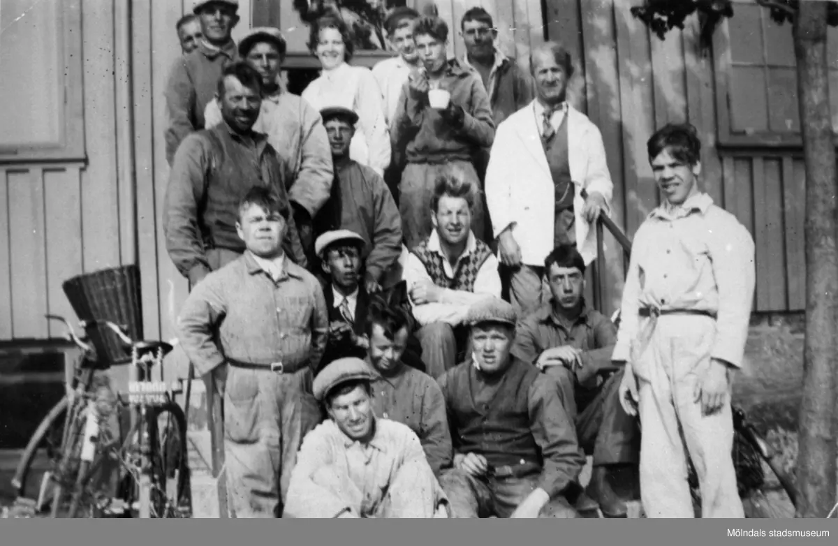 Utanför pojkarnas arbetshem på Stretereds skolhem, efter 1936. Bland personerna igenkännes Nils-Otto Bobäck, Alice, Gösta Bergström, Sven-Gustaf Berglund och Lasse Claesson.