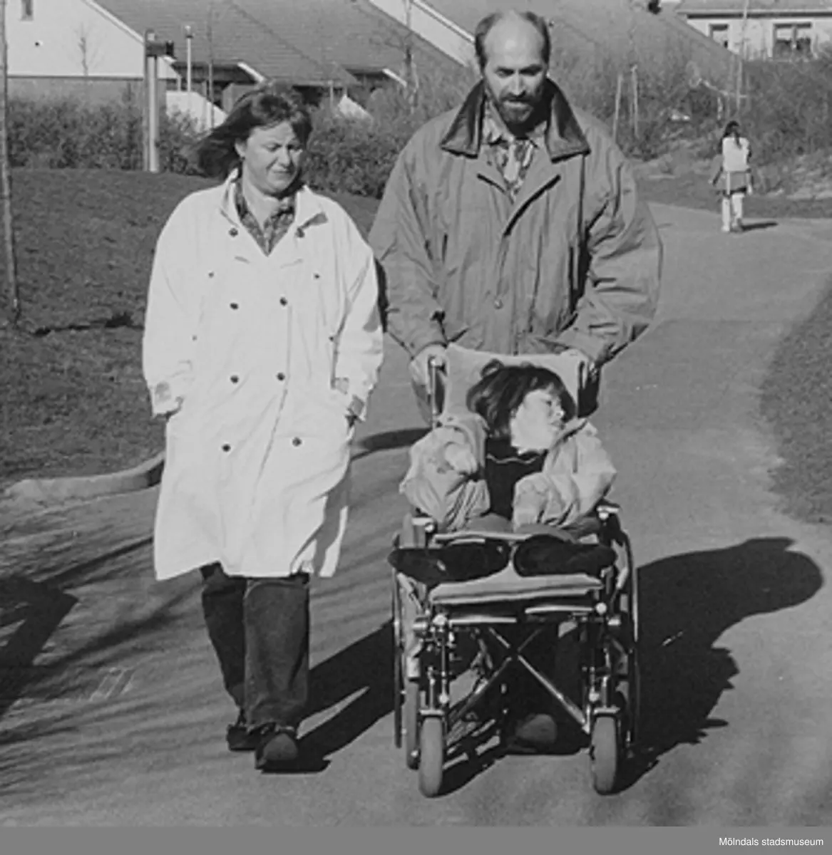 Rullstolsburna Emma på promenad med en man och en kvinna