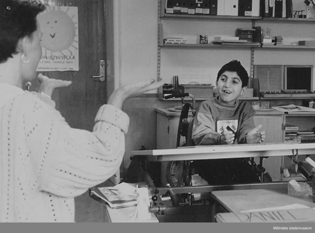 En rullstolsburen pojke vid en skolbänk med en lärarinna