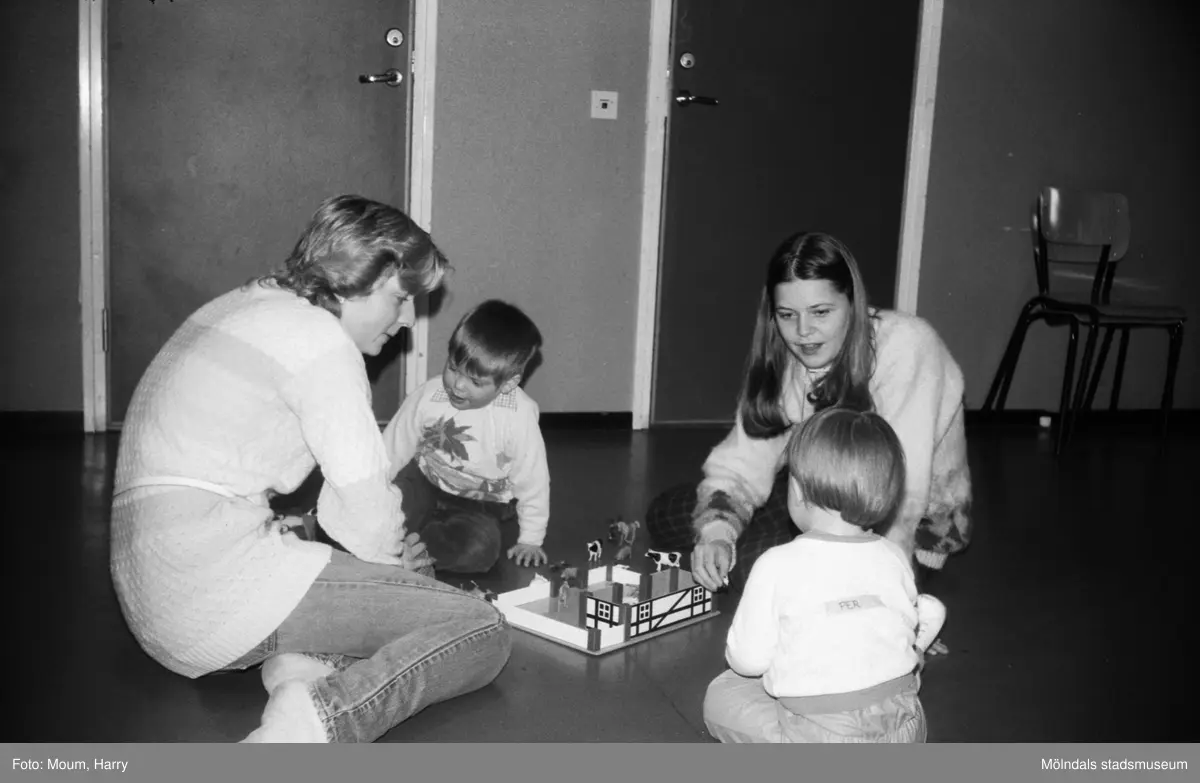 Öppen förskola på Almåsgården i Lindome, år 1983. Kvinnor och barn sitter och leker.