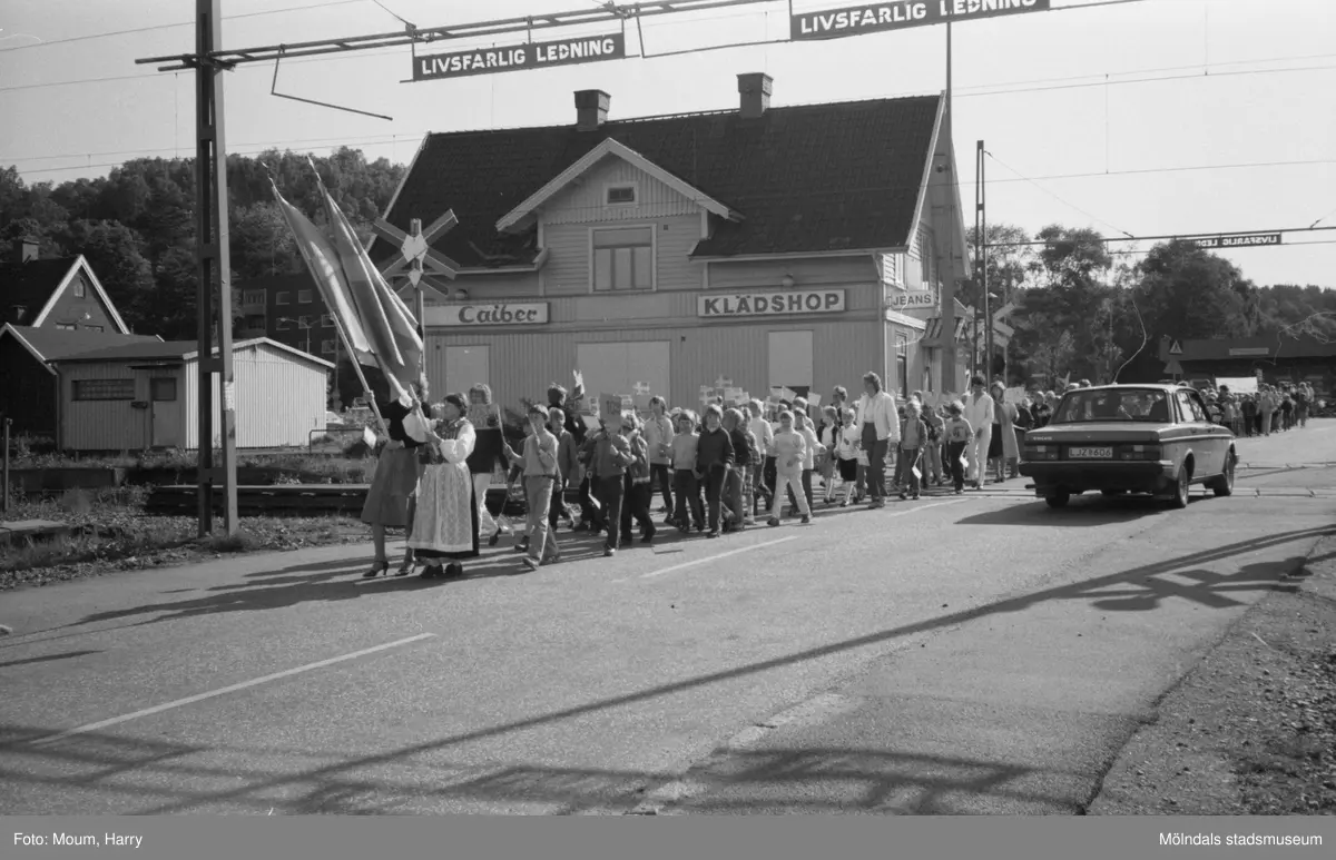 Nationaldagsfirande i Kållered, år 1983. Festtåg vid järnvägsövergången på Labackavägen.