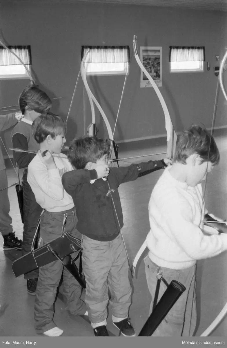 Titel: Bågskytte för barn under februarilovet i Mölndal, år 1985. För mer information om bilden se under tilläggsinformation.