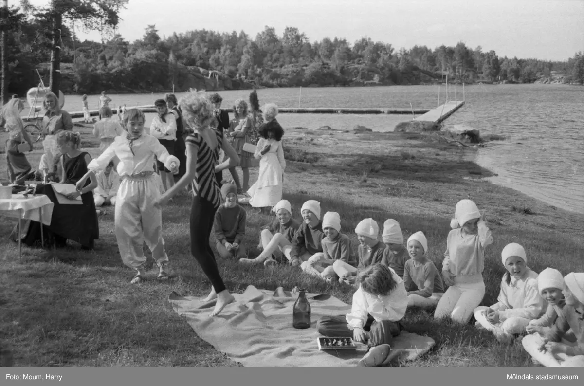 Teaterföreställning med Lindome judoklubb vid Barnsjön i Lindome, år 1984. "Sol, sommar och teater vid Barnsjön."