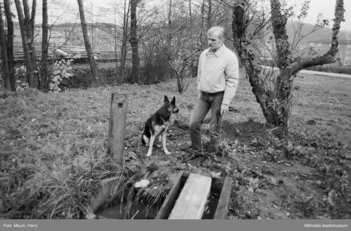 "Bengt Olsson med sin schäfer Olsson vid den 10 m djupa och vattenfyllda brunnen." Våmmedal i Kållered, år 1984.