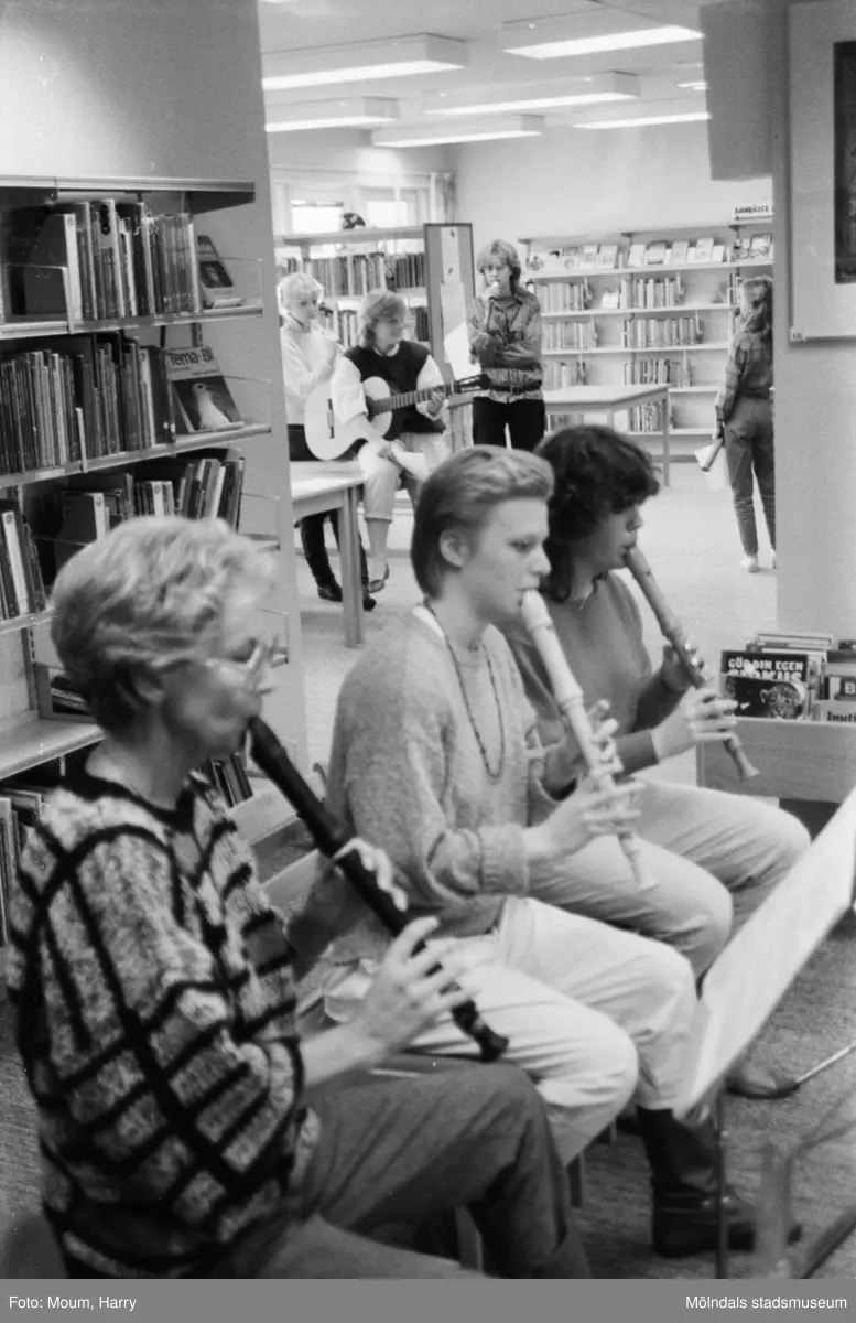 Musik, dockor och konstutställning på Kållereds bibliotek, år 1984. "Margret Jonsson, Anna Gustavsson och Anette Palmqvist musicerade i Kållereds bibliotek."