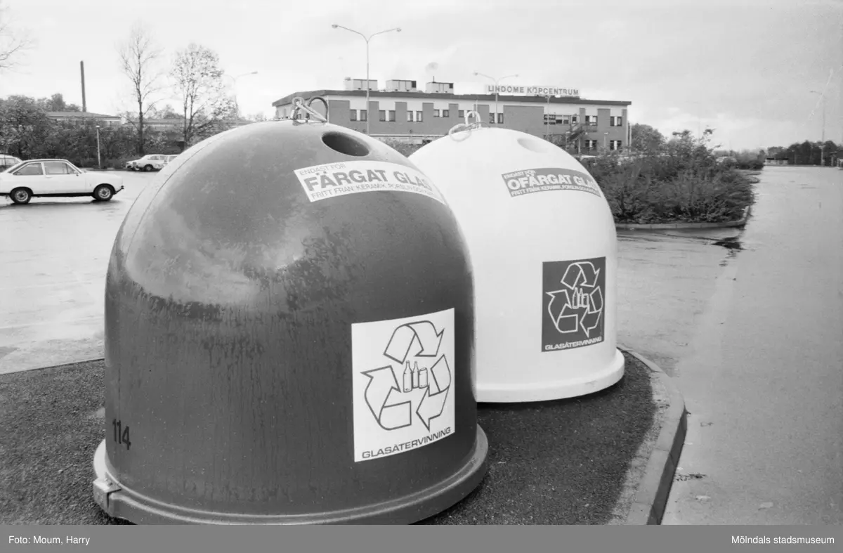 Återvinningsbehållare för glas i Lindome centrum, år 1984. "Gatukontoret har nu placerat ut dessa glas-igloos. Men de är enbart avsedda för glas. Annat material kan förstöra sändningarna till återvinningen."