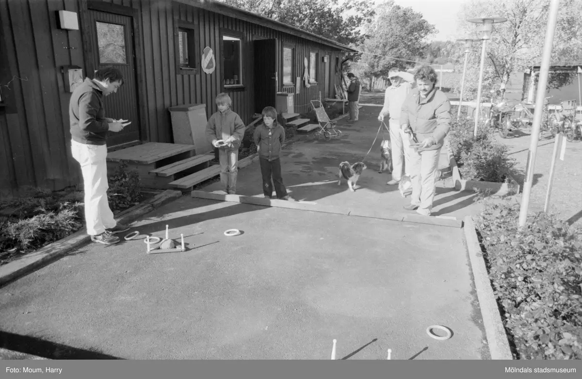 Lindome GIF anordnar Bunketorpslunken i Lindome, år 1984. "Kjell Ahlström klarar av det praktiska provet att få ringarna stanna kvar runt pinnarna. Malin och Jenny har litet närmare till "målet". Hundarna Emma, Frida och Higgins intresserade åskådare."