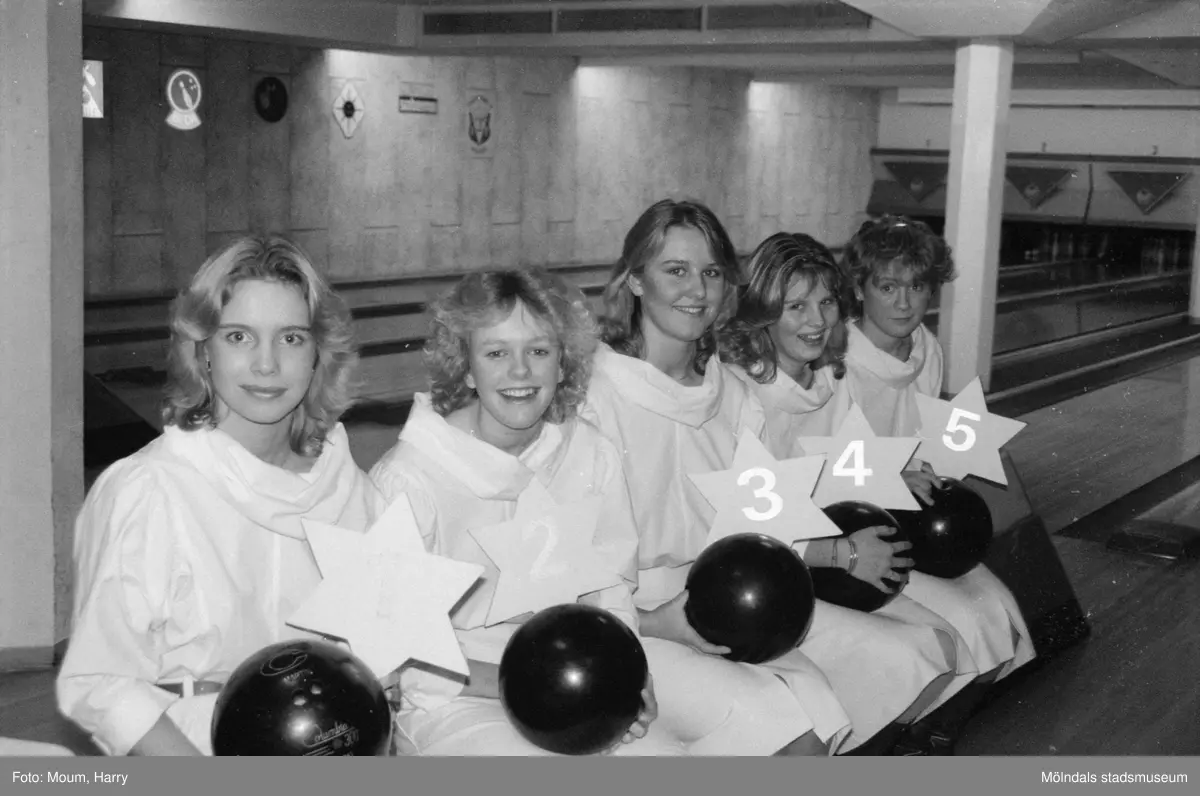 Titel: Kållereds lucia-kandidater samlar in pengar på Kållereds bowlinghall, år 1984. För mer information om bilden se under tilläggsinformation.