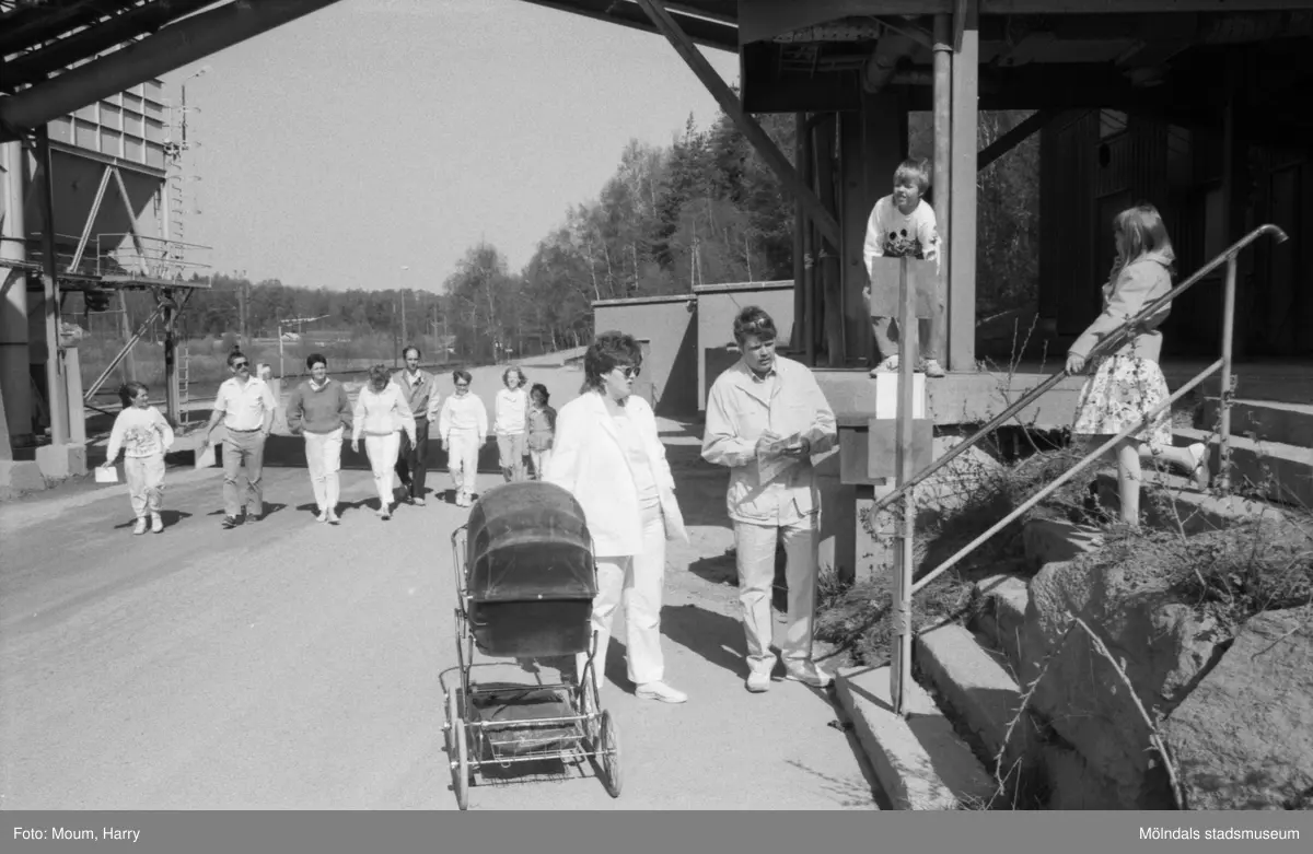 Poängpromenad på Sabemas område i Kållered, år 1985. "Här på bild syns närmast Roger Larsson och Ann-Christina Larsson med Madeleine-Anna i vagnen. Klättrar gör Johan 10 år och Jenny 7 år."