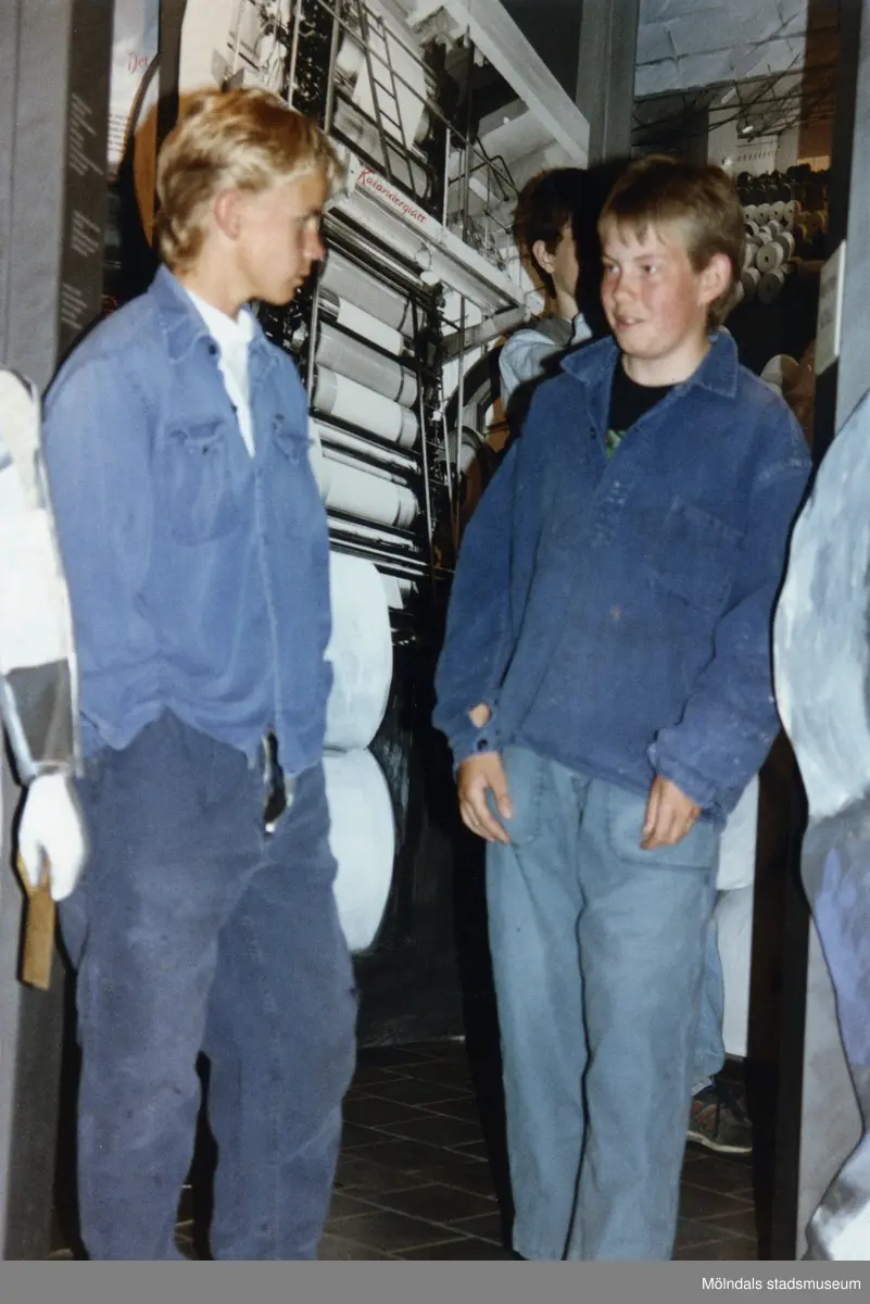 Foton från projektet "Museet - ett scenrum", 1990-tal. Klass 8A från Kvarnbyskolan dramatiserar i utställningen "Andra skiftet går på" med Papyrus historia som var en del av Mölndals museums basutställning t.o.m. år 2001.
