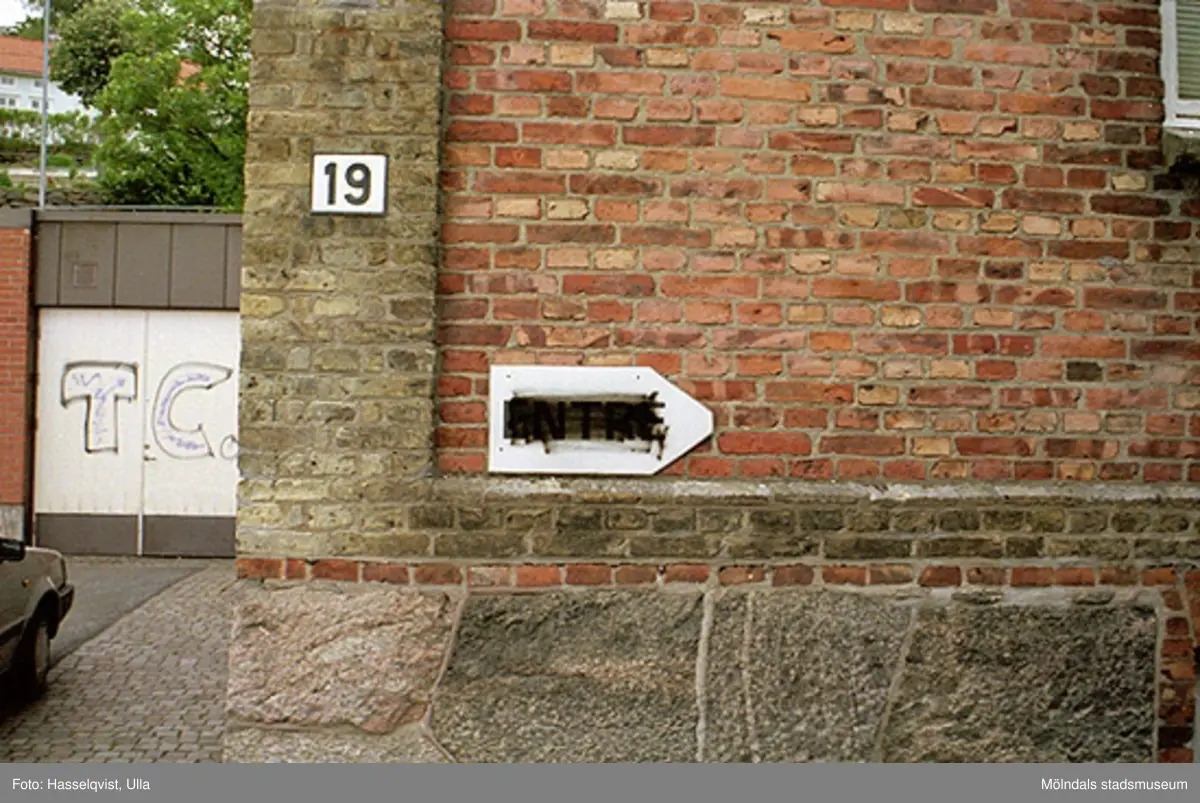 Någon har klottrat "TC." på Mölndals museums garage samt målat över entréskylten, Norra Forsåkersgatan 19, våren 1998.